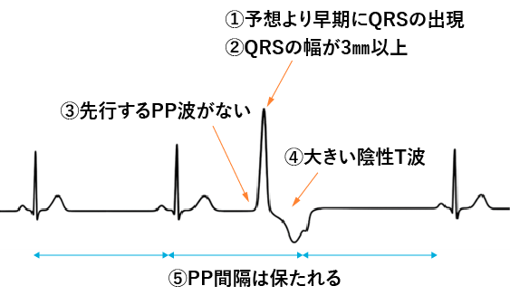 心室性期外収縮は予想された心室興奮よりも早期に出現し、先行するP波がありません。そして、伝導速度の遅い固有心筋を伝導して心室全体を興奮させるため心室内伝導に時間がかかり、QRS幅は3mmを超え、QRSと逆向きの大きなT波が特徴です。また、洞結節に影響を及ぼさないためPP間隔は保たれます。