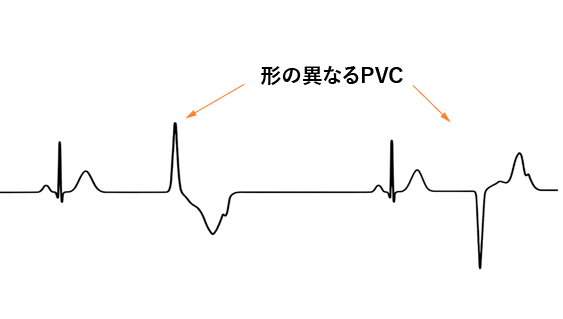 心室性期外収縮の形が互いに異なるものが認められる場合。つまりは、異なる場所から心室興奮があると考えられます。