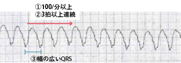 心拍数が120/分以上、通常3拍以上のものを心室頻拍と呼びます。