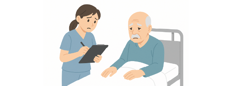 その後、1カ月ほど経ち、転倒の記憶も薄くなりつつある際に、なんとなく患者さんの活気がなくなり、食事量も減ってきていました。バイタルサインは特に変わらず、ただ、なんとなくぼーっとしている時間が増えていることが気になります。
