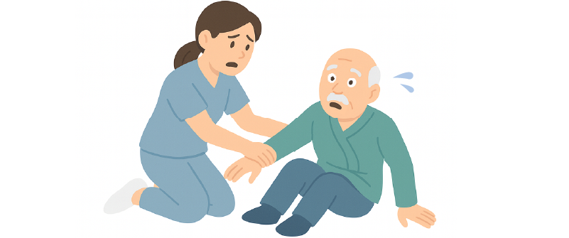 患者さんも転倒して驚いている場合もあります。ご本人の状況を見ながら、詳しい経緯を確認しておきましょう。床から起き上がる際に、両手足などの動きを見ながら、骨折していないかも見ていきましょう。